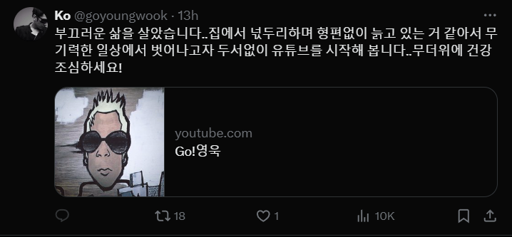 5일, 고영욱은 엑스(구 트위터)를 통해 "부끄러운 삶을 살았다"며 "집에서 넋두리하며 형편없이 늙고 있는 것 같아 무기력한 일상에서 벗어나고자 두서 없이 유튜브를 시작해본다"고 밝혔습니다.