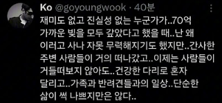 그 후 고영욱은 지난 4월 엑스를 통해 "재미도 없고 진실성 없는 누군가가 70억 가까운 빚을 모두 갚았다고 했을 때 난 왜 이러고 사나 무력해지기도 했지만"이라는 글을 올렸습니다.