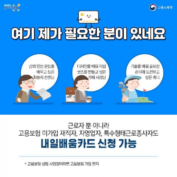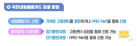 내일배움카드는 나라에서 교육비를 지원해주는 제도입니다. 특히 성인들을 대상으로 해서 취업이나 이직에 필요한 직무능력을 개발할 수 있도록 돕는 제도입니다. 취업하고 나서도 현장 업무에 필요한 교육들을 받는데에도 쓸 수 있습니다. 잘만 활용한다면 정말정말 좋은 정책인데요.